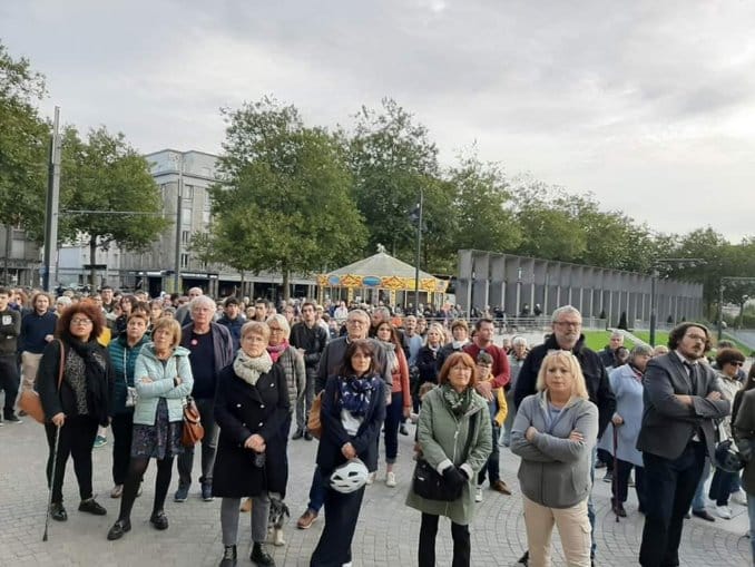 Les communistes, élu.e.s et militant.e.s, présent.e.s en nombre lundi 16 octobre au rassemblement de Brest en solidarité avec les enseignants et personnels de l’éducation nationale victimes du terrorisme islamiste: Samuel Paty, Dominique Bernard et les autres personnels blessés à Arras.
