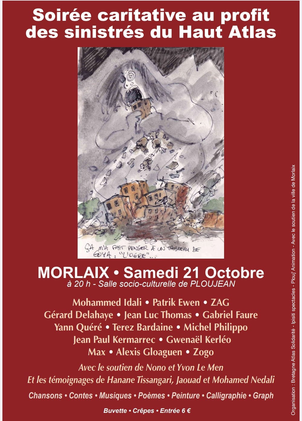 Soirée caritative au profit des victimes du tremblement de terre du Haut Atlas au Maroc – à Morlaix, Ploujean, samedi 21 octobre à 20h (6 euros l’entrée)